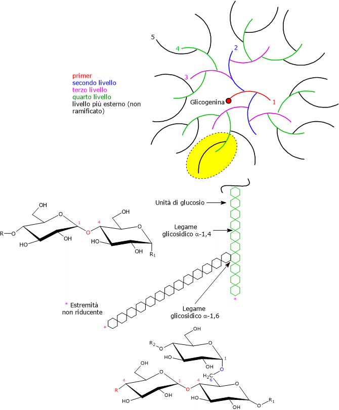 Il glicogeno è un polimero ramificato di unità di D-glucosio con funzione di deposito del monosaccaride, quindi di energia.[1]