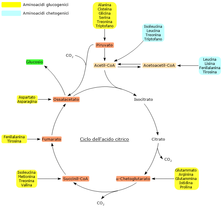 Gli amminoacidi sono i costituenti fondamentali delle proteine. Una volta che il loro pool disponibile è sufficiente a soddisfare le necessità della sintesi proteica, non disponendo l’organismo di riserve specifiche di amminoacidi paragonabili a quelle del glicogeno per il glucosio o dei trigliceridi per gli acidi grassi, converte l’eccesso di amminoacidi in intermedi del ciclo dell’acido citrico, impiegandoli nella produzione di energia.[2]